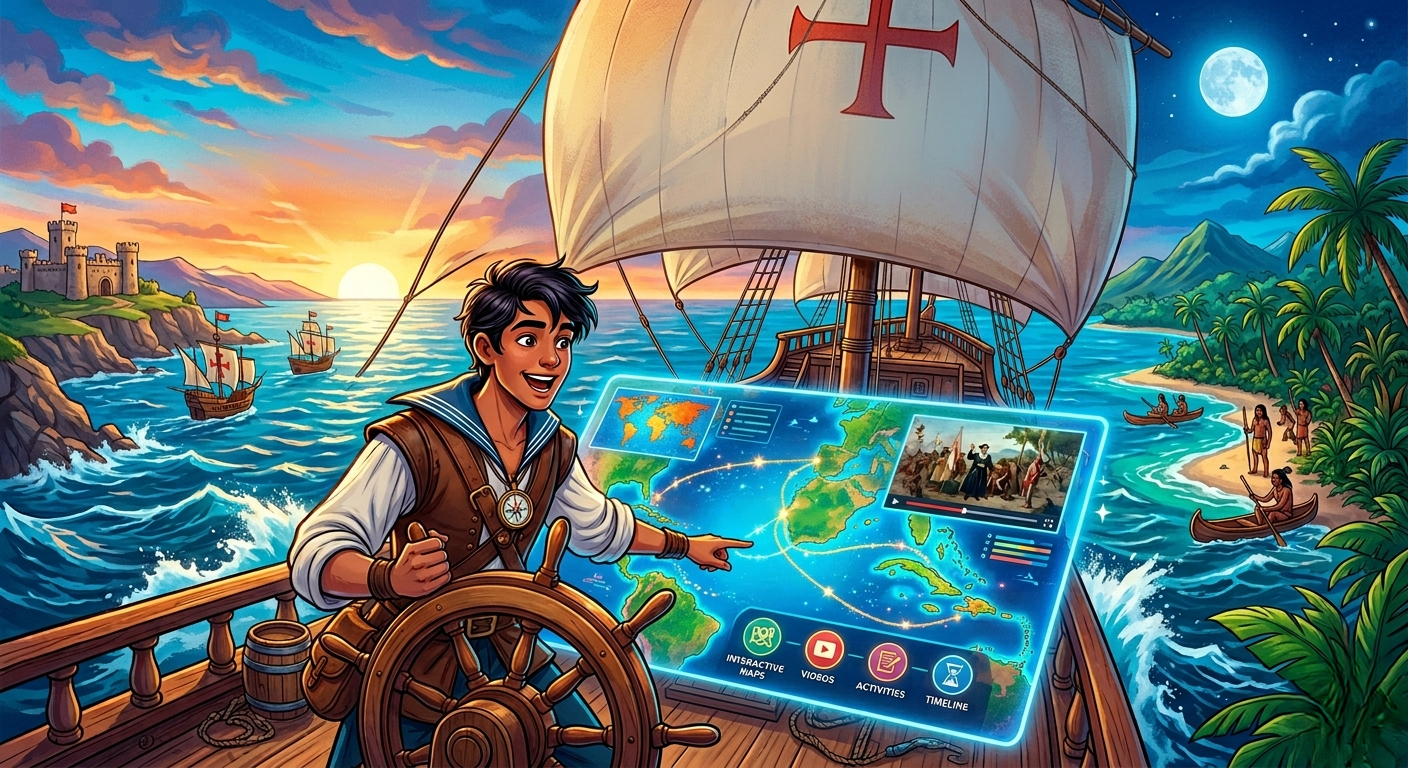 Este curso guía a los estudiantes a través de uno de los momentos más importantes de la historia: el encuentro entre Europa y América en 1492. A través de una narrativa tipo aventura, el estudiante asume el rol de un navegante que explora tres grandes etapas del proceso histórico.